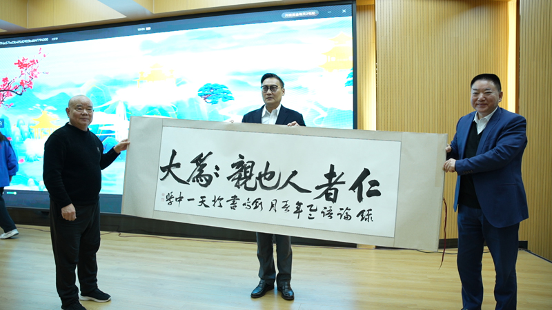 校園參訪中,孔垂長(zhǎng)一行實(shí)地考察了教學(xué)設(shè)施與校園環(huán)境,隨后出席在學(xué)校多功能報(bào)告廳舉辦的傳統(tǒng)文化歡迎活動(dòng)。該校師生以拜師禮、古琴演奏、太極展演及《弟子規(guī)》吟誦等節(jié)目,展現(xiàn)對(duì)中華文化的傳承??状归L(zhǎng)以“學(xué)以成人”為主題發(fā)表致辭,強(qiáng)調(diào)在人工智能時(shí)代,教育更應(yīng)回歸“成人之道”:“教育需培養(yǎng)有道德判斷力的心靈與理解人性溫度的靈魂??鬃铀浴居诘溃瑩?jù)于德,依于仁,游于藝’啟示我們,在科技洪流中需守護(hù)對(duì)美的感知力,保持思辨銳度?!彼銊?lì)學(xué)子成為“科技方舟的駕馭者”與“文化精神的擺渡人”,并向天一中學(xué)贈(zèng)送親筆題字的晶瓷孔子像,校方則以書法作品回贈(zèng)。