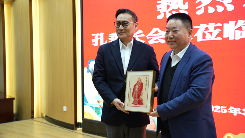 孔垂長(zhǎng)會(huì)長(zhǎng)向孔令發(fā)董事長(zhǎng)贈(zèng)送《至圣先師象》
