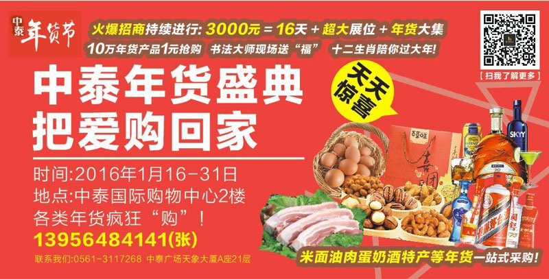 您好!誠(chéng)摯邀請(qǐng)您和貴單位參加由淮北市人民政府支持,淮北市食品工業(yè)協(xié)會(huì)、淮北市代理商聯(lián)合會(huì)主辦,淮北天宇廣告有限責(zé)任公司承辦的“中泰國(guó)際·2016 中國(guó)(淮北)年貨展銷節(jié)”(簡(jiǎn)稱:2016淮北中泰年貨節(jié))年文化主題盛會(huì)。2016中泰年貨節(jié)主題活動(dòng):第一大主題年俗,即中國(guó)傳統(tǒng)年文化為主題,比如:民俗手工藝(捏糖人、剪紙、繡花等)等;第二大主題年味,即年的味道,我們過年時(shí)所需要的吃喝玩樂購(gòu)等商品,趕集、年貨一站式采購(gòu)。