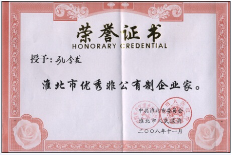 2008年孔令董事長(zhǎng)獲評(píng)淮北市優(yōu)秀非公有制企業(yè)家